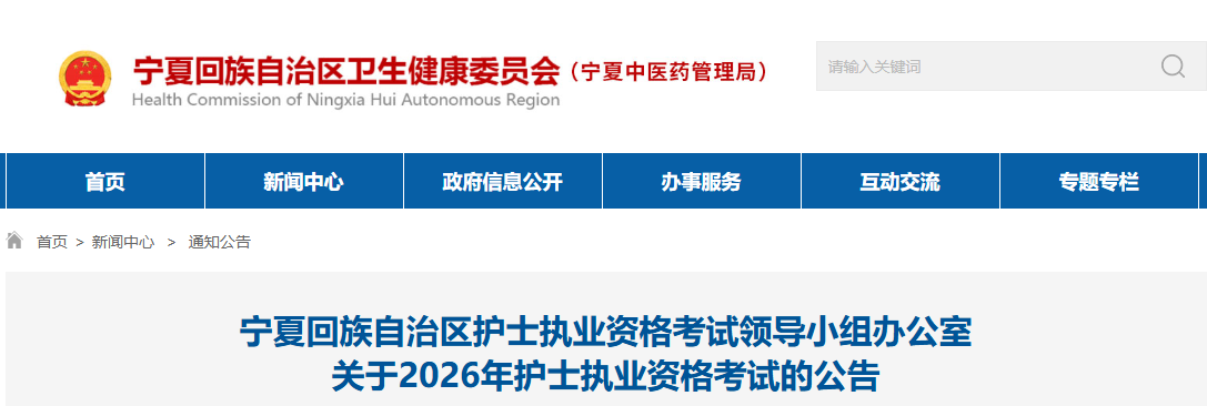 根据《全国护士执业资格考试委员会办公室关于2026年护士执业资格考试有关问题的通知》(护考办发〔2025〕4号)和《国家卫生健康委人才交流服务中心关于2026年度护士执业资格考试考务工作安排的通知》(卫人才发〔2025〕75号)精神,现就做好宁夏考区2026年护士执业资格考试有关事宜公告如下。